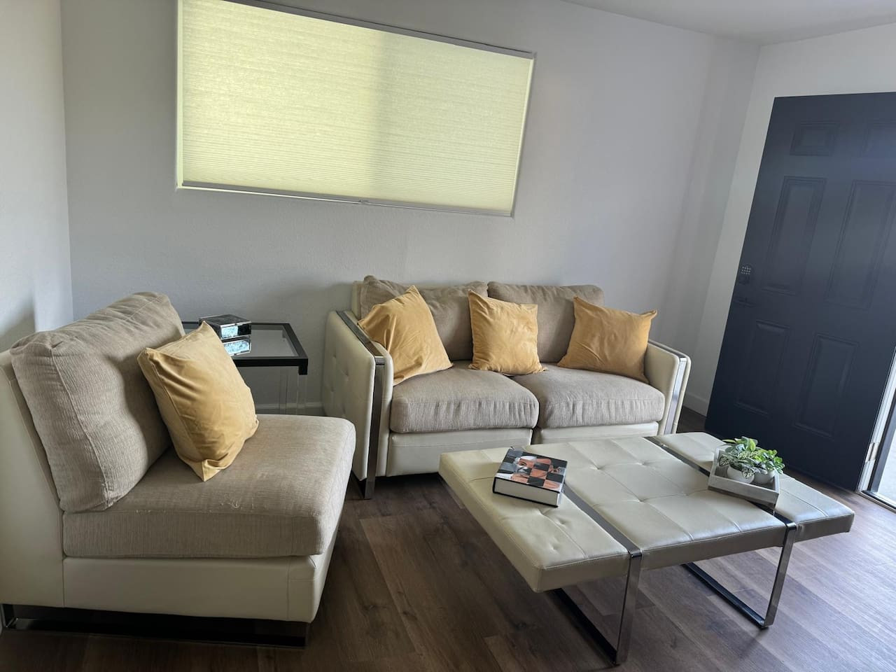 Comfortable Living Area: Relax in the stylish living room, complete with comfortable seating and a Smart TV for your entertainment.