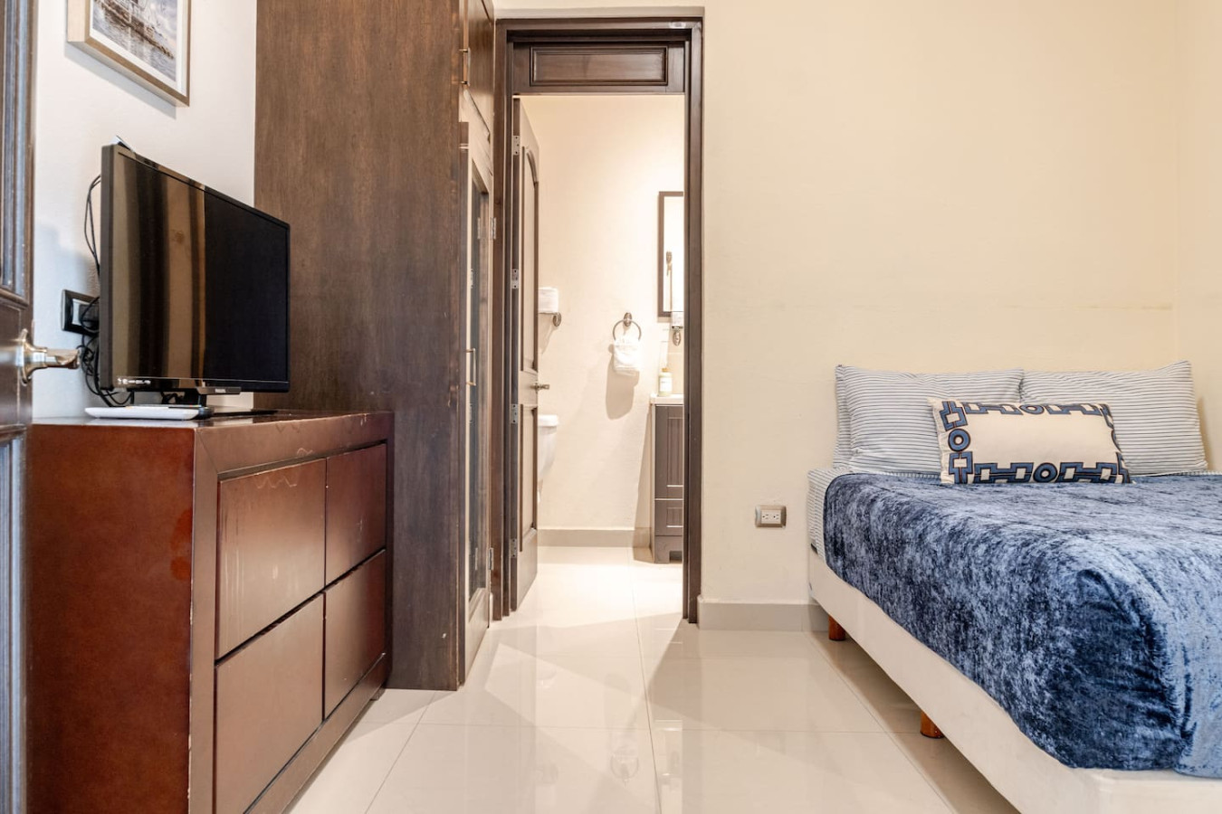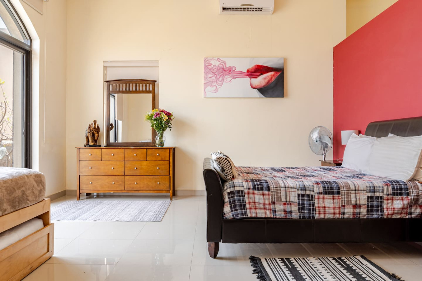 Equipped with a flat screen Smart TVs, safety box, Wi-Fi internet air conditioning, and ceiling fan.